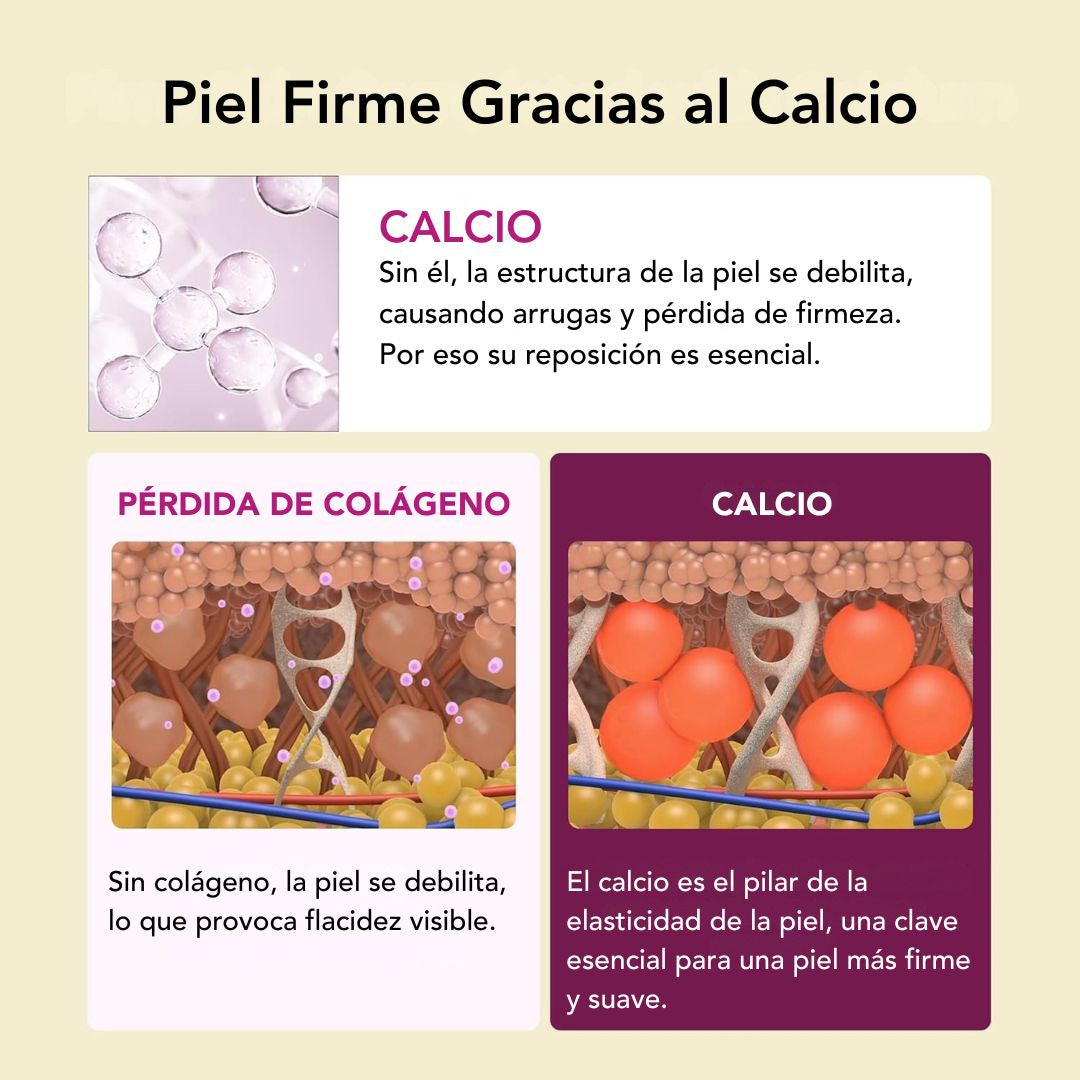 Su combinación de calcio + péptidos + hidratación profunda.